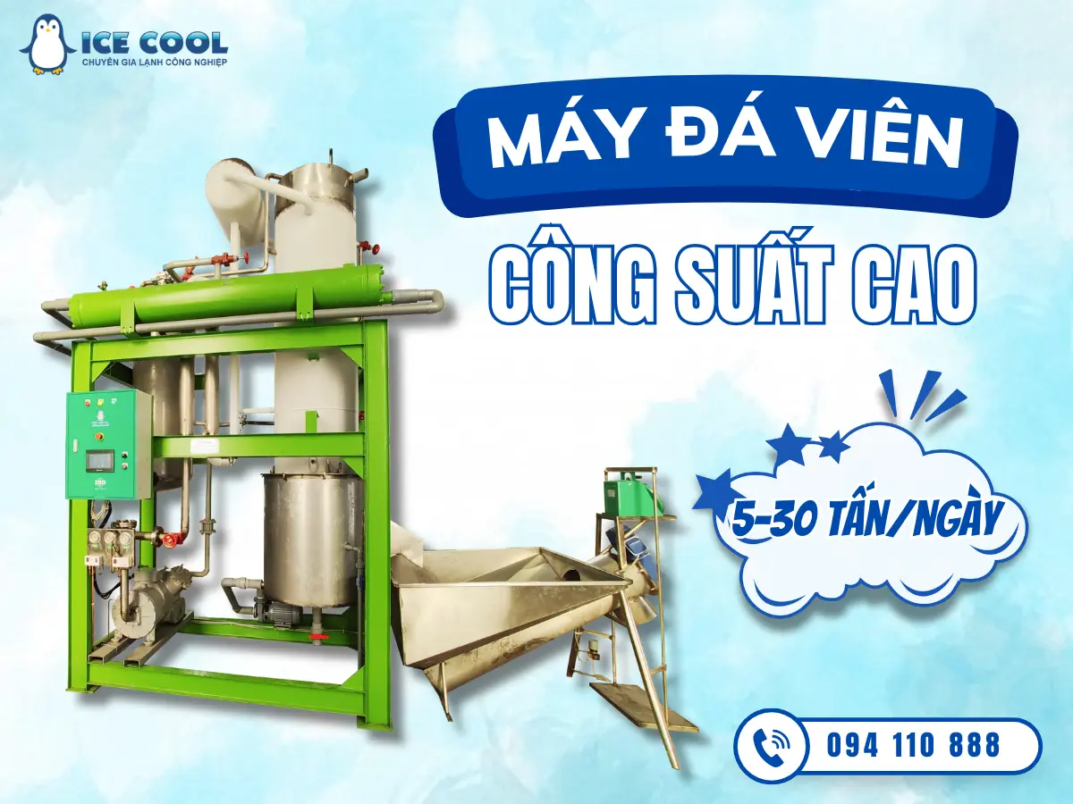 Máy đá viên công suất cao là thiết bị chuyên dùng trong ngành sản xuất đá viên tinh khiết với quy mô lớn, có khả năng vận hành liên tục và cho ra sản lượng từ 5 tấn – 30 tấn/ngày. Đây là dòng máy phù hợp với các xưởng đá công nghiệp, nhà máy cung ứng đá viên cho các đại lý, siêu thị, chợ đầu mối, quán nhậu, quán cà phê, cảng cá hoặc dùng trong bảo quản thực phẩm.